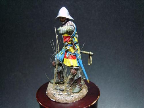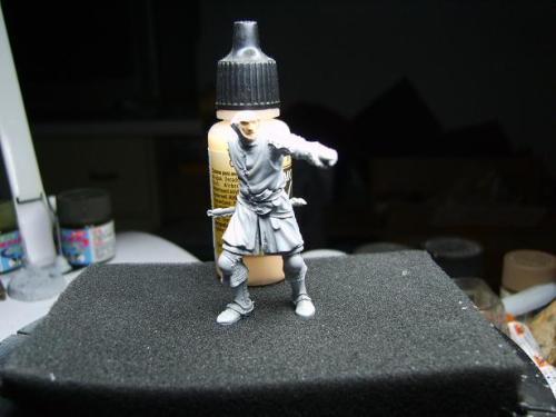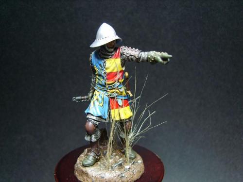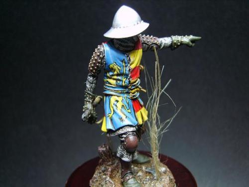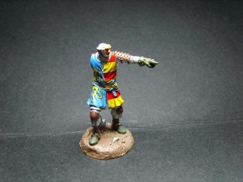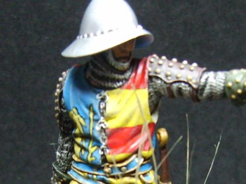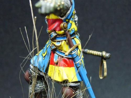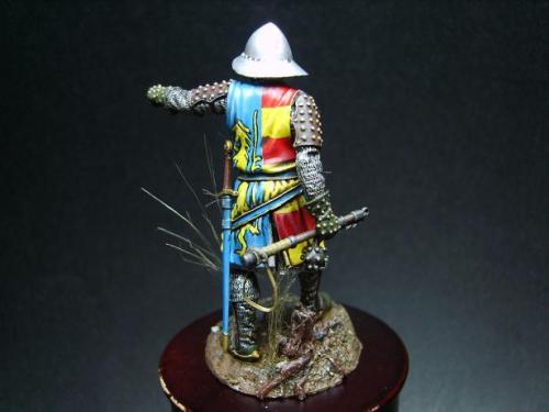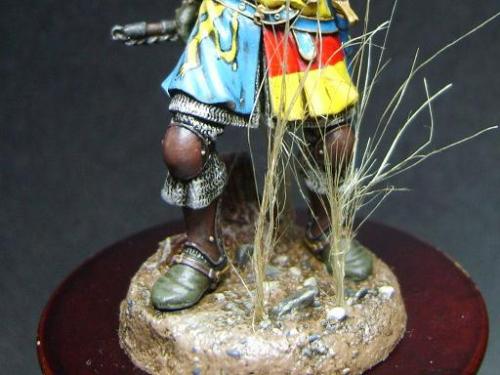 使用了毕加索的54毫米金属套件。只是在链锤的带子上切掉用合适的纸代替。细节没得说。毕加索的东西全身上下都是细节! 我觉得唯一的难点是战袍上的狮子。由于盒子的封面只有一张侧图。所以需要上网查找各种中世纪罩袍狮子图案的资料。 最后借着一点绘画功底,用深色打底,然后用正黄色一点点的描绘出来。 其实只要有耐心和信心,先总简单的开始。慢慢的一步步提高就可以了!