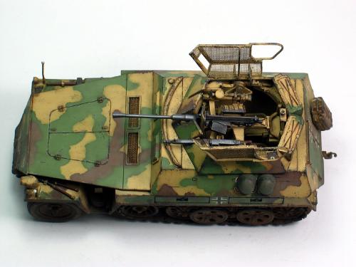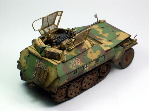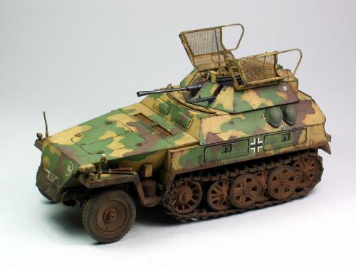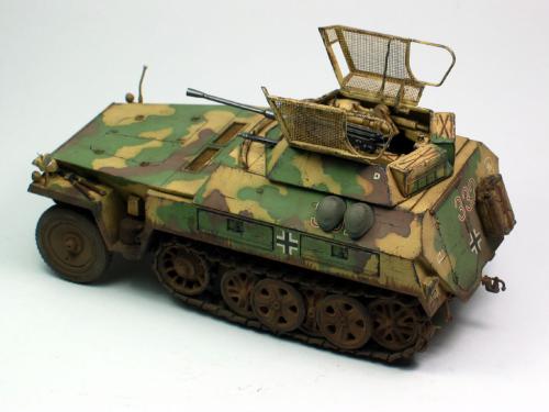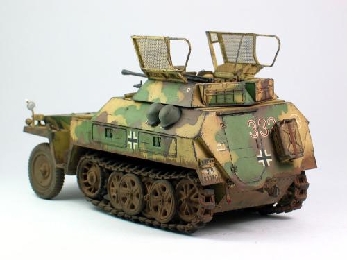 三色自行调出,依次使用遮盖带遮盖喷涂,完成后用2000#砂纸打磨油漆突起边缘,原色沿边缘作出轻微虚化,使整体更为自然而不突兀。贴水帖,全车珐琅色重洗,渗线,点涂掉色,共使用4色掉色作出渐变,增加2个钢盔让车体变得饱满一些,后部增加一个油桶增加看点。