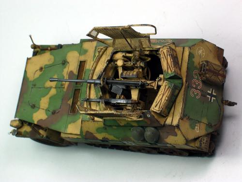 港龙套件,炮口丢失,自己用电钻车了一个炮口消焰器装上,用滤网制作了防护网,田宫PE上多下来的一个对空瞄准器添加上,用针灸针制作了天线,不过摄影的时候忘了添加上了。