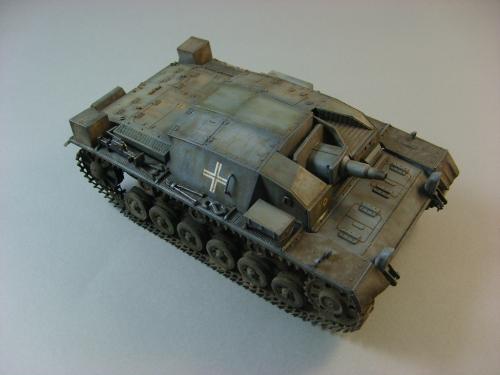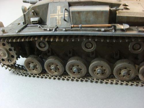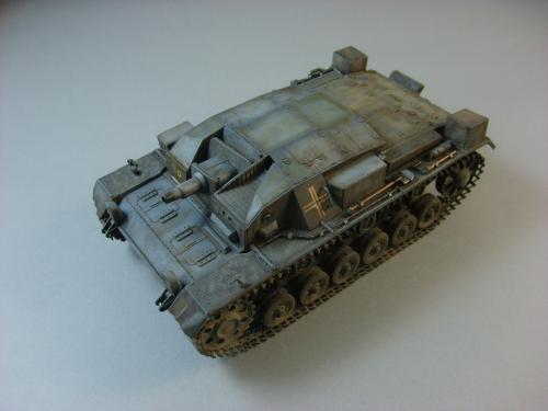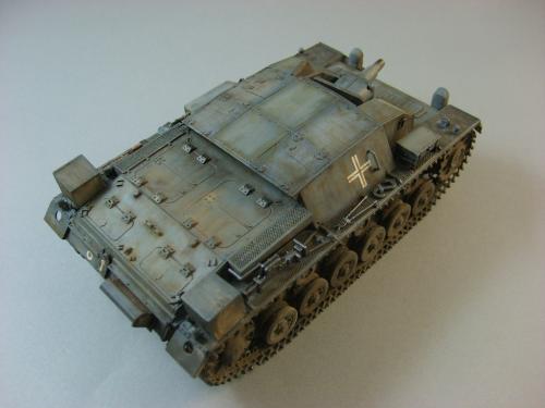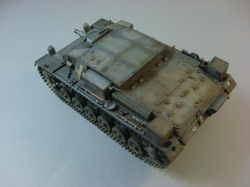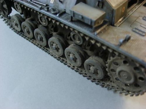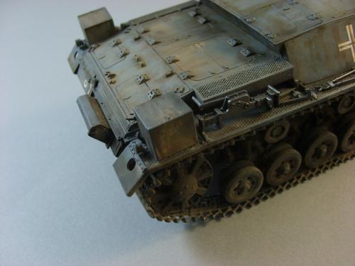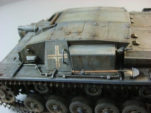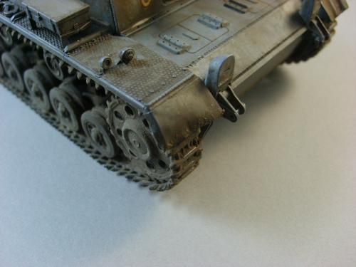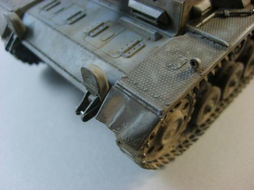 套材为威龙9031,全车基本直做,用银箔改造了两块前挡泥板,并制作出碰撞后的弯折感,上色后感觉不错 :)。全车制作重点在于底盘泥土和车体污渍的表现。底盘泥土前后共5次上色,由深至浅,比较有层次感。污渍的表现使用了洗、滤镜和干扫等多种技法,表现了多种污渍效果,并使得模型的色彩层次更丰富。