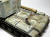 这件作品是源于大一时候的一个烂尾,在寒假里,为了消灭堆积。才罩上了一层雪地迷彩。 整个作品是直做无改,但由于烂尾时间稍长,丢失了一些小部件,作品的完整性有些遗憾。本想再加些防水布来遮羞,但实在是来不及了。 三年前,作品是按照最基础的方法制作的(当时算是刚开始玩)。预置阴影、喷郡士的苏军绿1、炮塔稍微做了下滤镜、略微处理了一下履带。 这次的烂尾翻新也可以说是一次雪地技法的实验,像是雪地还有发胶都是第一次用。在上雪地迷彩之前,做了以下处理:1、模仿CM,用另一种绿色略微处理了一下舱门舱盖。2、用德国灰重新喷涂履带。 本次雪地迷彩使用的主题技法是发胶掉漆,由于没有买到发胶,以啫喱水作为代替,效果并不是那么理想。之后又用硬毛笔添加了些磨擦剐蹭的效果。这就是第一张的效果图。但这时我们对比雪地迷彩的照片,回想石膏的涂抹。我们会发现目前的效果是剥落、摩擦感足够,而雨水的冲刷感不足。所以在之后我用补充了其他雪地常用技法,包括溶剂的擦拭,毛笔沾溶剂戳,还有白色的重新补涂。以上的流程结束后就是第二便的效果。之后在一些高手的建议下,我用重新在战车的上部还有人员活动较为频繁的地方再做处理。但本应使效果再上一层楼的处理,却成了悲剧的开始。由于油漆浓度处理的不得当,海绵雕漆弄得很难看。但事已至此,也不好再改了。 之后的渍洗很平常,就是仿照mig的自然渍洗液的颜色调了渍洗液。 之后是掉漆,是本次制作最为失败的步骤,掉漆没点多少,但还是一团糟。 那么下面就是泥污的制作,泥污其实很简单了。就是按照adam wilder的做法。这里我想提醒大家的是,一定要记住plaster for volume。泥土的量是来源于石膏而不是mig土,泥土的色彩可是是mig土也可以是水性漆,油画色。但要明白的是,泥土干了会变浅,一定留好富裕的颜色来源(用于处理变化)。之后处理些变化做一些飞溅。这个步骤的遗憾是,土的厚度变化不够明显,也没添加草针。 再之后就是尘土处理,还是无法处理好颗粒感,很是遗憾。 最后就是处理履带和轮子的磨损感。 到此本次的制作就基本完成了。要是有时间补上两块防水布就好了。但总得还是效果还是令自己满意的,相比之前还是有进步的。