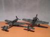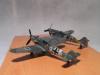 爱德美1/72的两个小东西,两张水贴全部用完了,用郡士带背胶软化济+台湾仙盈软化济+田宫溜缝胶摆平,包括爱德美109独有的机身段舱编号(基本上和水性笔笔尖差不多大小) 两架做的都是二战德军战斗机后期RLM74、75、76色,云雾+斑点图装。参考了一些资料,有些109机身是模糊迷彩边界、机翼是硬迷彩边界;而190几乎机身、机翼均为模糊迷彩边界,徒手喷涂。没贴水贴前109上的斑点看起来大小还好,可贴完后发现点点大了一点,而且好多背水贴盖住。190的斑点感觉喷的还好,可惜后来也被拉烟盖住了。所有机炮均用手转打孔。