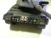 AFV CLUB这套履带我也略有所闻, 就是经颜料和溶剂侵蚀会变得很脆。我决定用郡氏水性黑金属喷涂, 打算水性比较温和, 结果这履带也发生多处断裂, 其中一条履带断成六段, 一拿起就断, 真是气人! 迫我使用强硬手段对付:先用车軩色手涂履带挂胶, 再用胶带将履带全条黏住装在车上, 将每一个活动关节用流缝胶黏死! 结果行走部份变得不能行走。我留意到尽管簇新的豹2履带金属部份都会生锈, 所以用啡色油画颜色做出履带生锈效果。